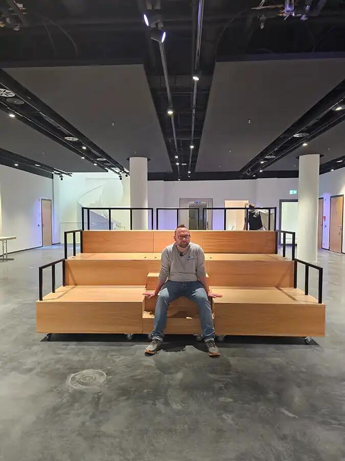 Im Untergeschoss glänzt die fahrbare Sitzinsel als wahres Meisterwerk. Aus sechs Elementen mit je drei verstellbaren Modulen entstand ein flexibles System, das Gewichtsvorgaben einhält, Stabilität garantiert und sich als Sitzgruppe, Präsentationsfläche oder Rückzugsort wandelt. Holz, Metall und Polsterstoffe verschmelzen hier zu etwas Lebendigem – ein Moment, in dem Schreinerhandwerk zur Kunst wird und uns mit Stolz erfüllt.